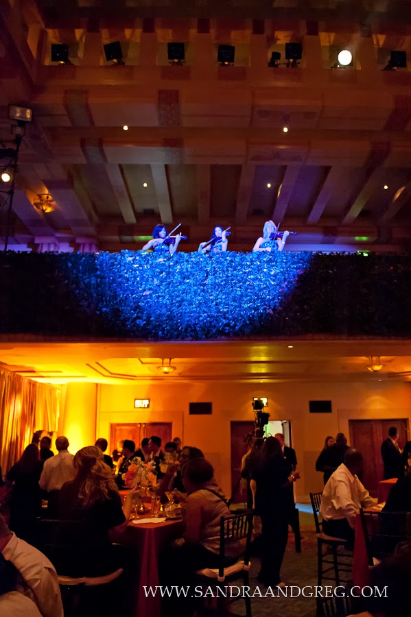 From the upper balcony a “hanging garden” graphic was installed. This enhanced the environment and also served to cover many of the motifs in that area of the room. Tables were placed in the room to enhance seating capacity and all were draped in Apple Green linens to add sparkle and pops of color to the garden décor. With ambient lighting we enhanced the beauty of the room and strategically projected trees and branch designs. The accent lighting on the venue walls most gave the appearance of an expanded garden setting.